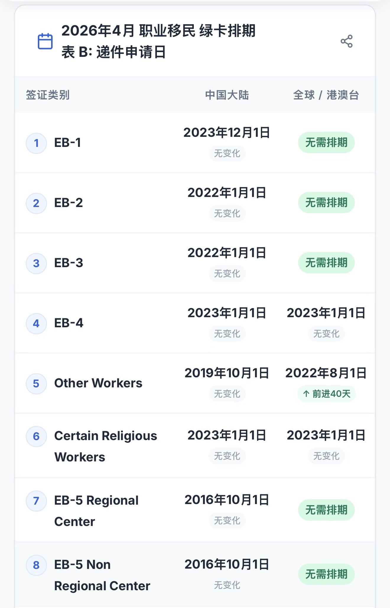 - 除中印外,全球其他地区 EB-1/2 均无排期!台湾籍 / 配偶非中印的申请人,获批直接拿绿卡